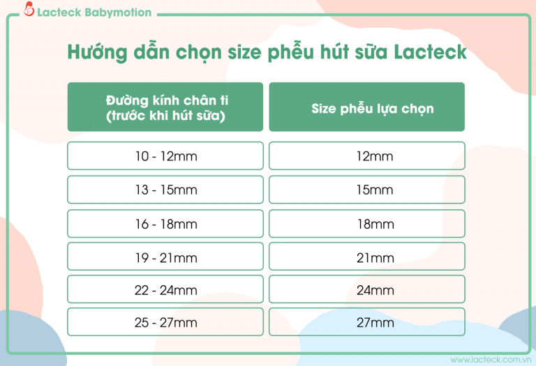 Mẹ lựa chọn size phễu tương ứng như bảng bên dưới: